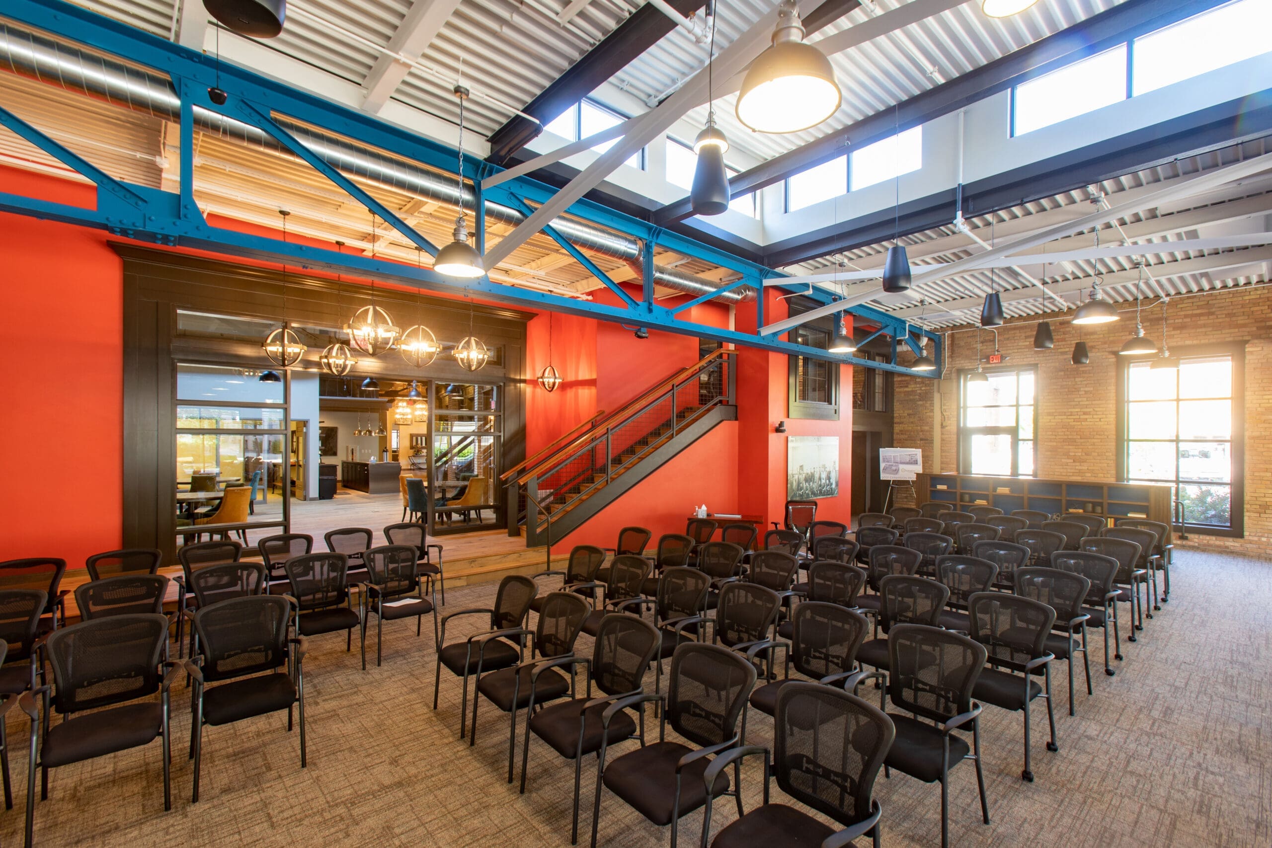 Located at 110 S. Adams Street in downtown Green Bay, this 10,314-square-foot commercial office space serves as the headquarters of InitiativeOne, a leadership development and consulting firm. The historic building was renovated in two phases, with the 2021 buildout earning the Green Bay Mayor’s Beautification Award and incorporating reclaimed materials throughout.