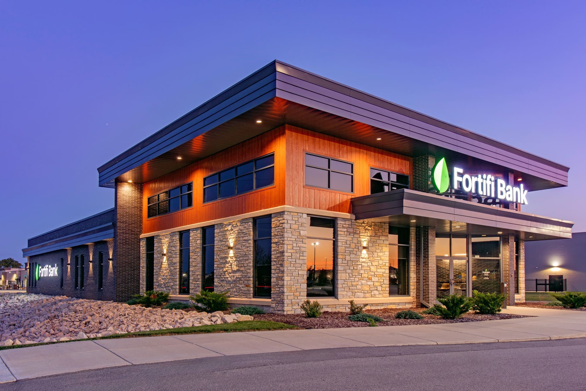 This 4,650-square-foot community bank branch is located at 701 Cormier Road in Ashwaubenon, Wisconsin. The modern one-story building features brick, stone, and architectural metal panels with a drive-through window. It opened in 2019 and serves as a full-service Green Bay area commercial banking location.